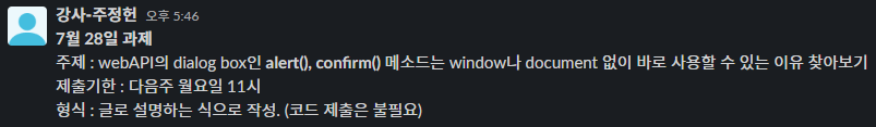 주제: webAPI의 dialog box인 alert(), confirm() 메소드는 window나 document 없이 바로 사용할 수 있는 이유 찾아보기