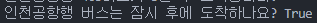 # 질문 : 인천공행행 버스는 잠시 후에 도착하나요? (도착시간이 5분보다 적으면 잠시후 도착이라고 함.)