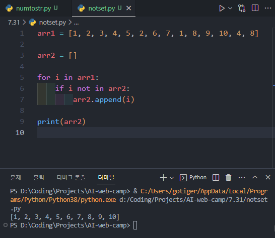 2. 파이썬으로 일부 중복되는 element를 저장하고 최소 element가 10개이상 되는 배열을 만든다. 그리고 set() 구문 없이 오로지 for in 문으로 배열의 중복된 값을 없애는 코드를 작성하기