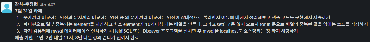 1. 숫자끼리 비교하는 연산과 문자끼리 비교하는 연산 중 왜 문자끼리 비교하는 연산이 상대적으로 불리한지 이유에 대해서 정리해보고 샘플 코드를 구현해서 제출하기