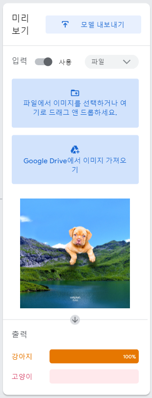 이미지 업로드 후 [모델 학습시키기] 버튼 클릭 후 테스트 이미지로 확인 가능