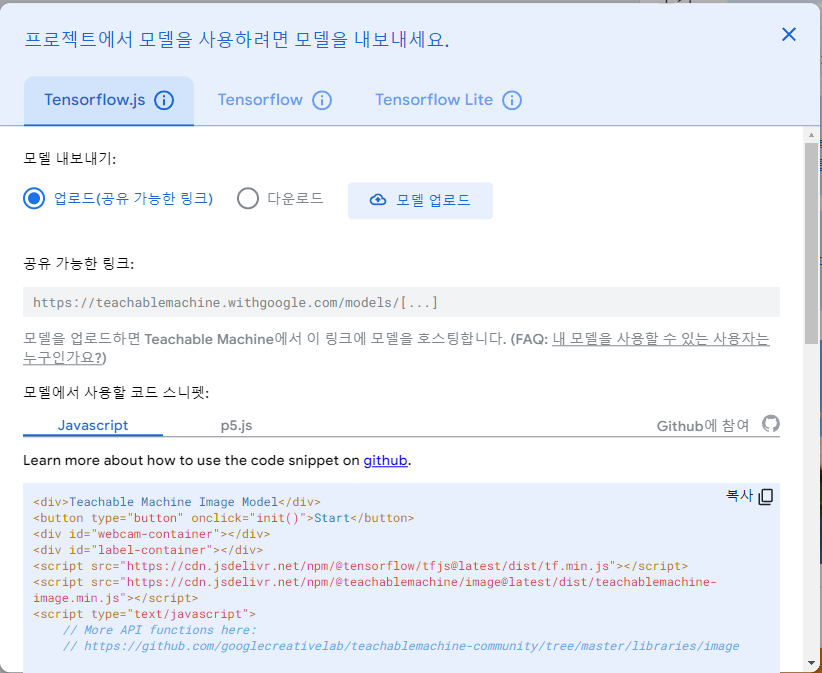 모델 내보내기 버튼으로 각 코드 스니펫을 확인할 수 있다.