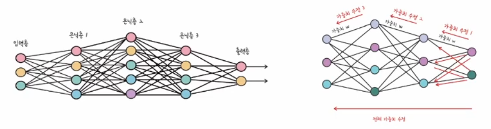 - 뒤로 가면서 가중치를 수정한 다음 다시 한번 데이터를 흘려보낸 수 결괏값을 살펴봄