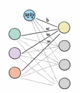 각 선에는 가중치라는 서로 다른 값들이 저장되어 있다 - 편향 값은 각 층에 하나의 값으로 존재