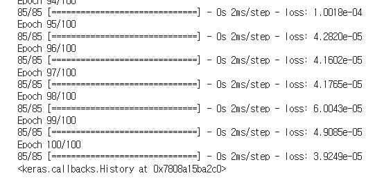 model.fit(X_train, y_train, epochs=100, batch_size=1, verbose=1)