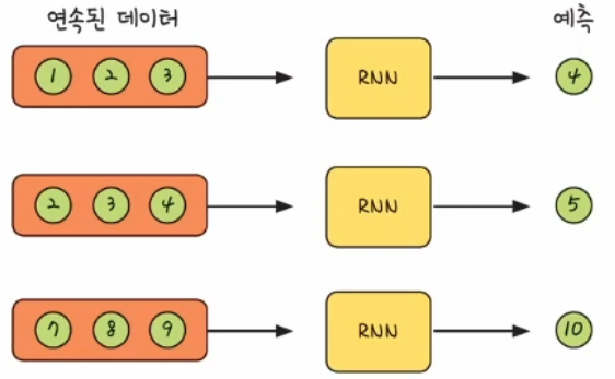 - 순환 신경망(RNN) 모델은 이전의 연속된 데이터를 사용하여 이후의 값을 예측한다