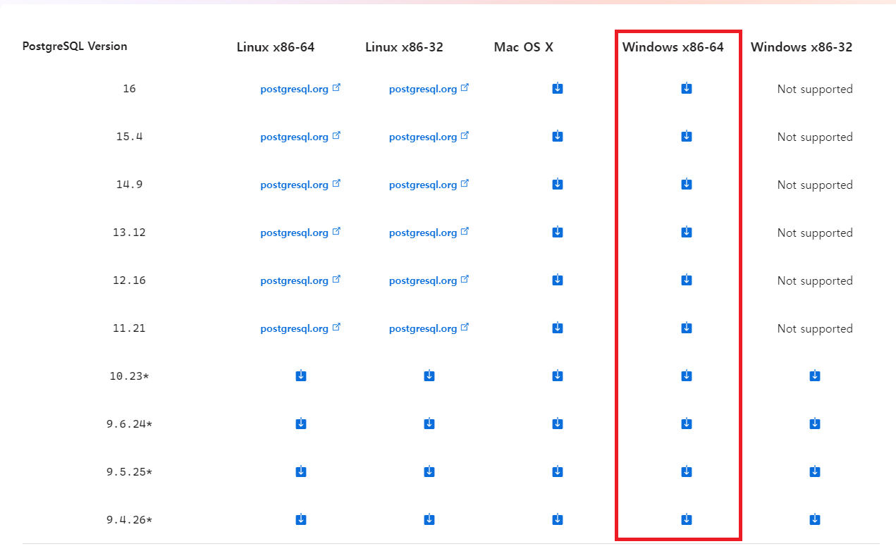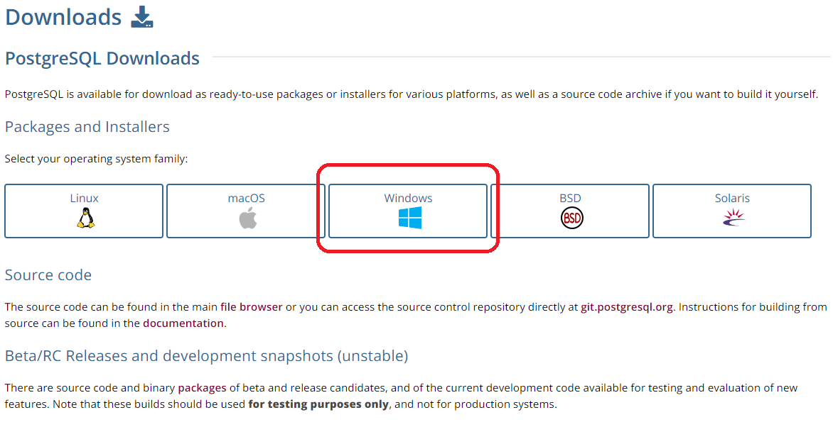 PostgreSQL 공식 사이트 (https://www.postgresql.org/) > Download 메뉴(https://www.postgresql.org/download/)