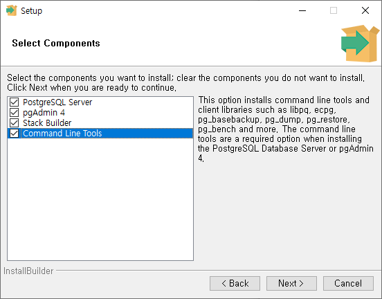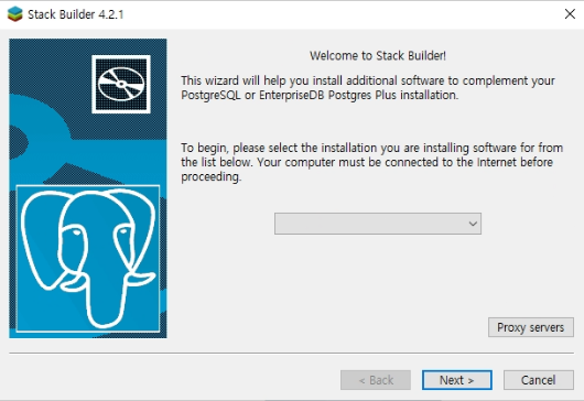 - Stack Builder : PostgreSQL에 에드온을 쉽게 설치하고 관리할 수 있게 하는 유틸리티