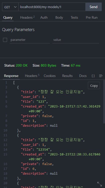 다음 과 같이 /my-models/{userId} 엔드포인트로 유저id 와 같이 요청을 보내면