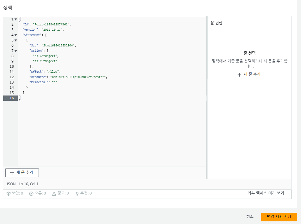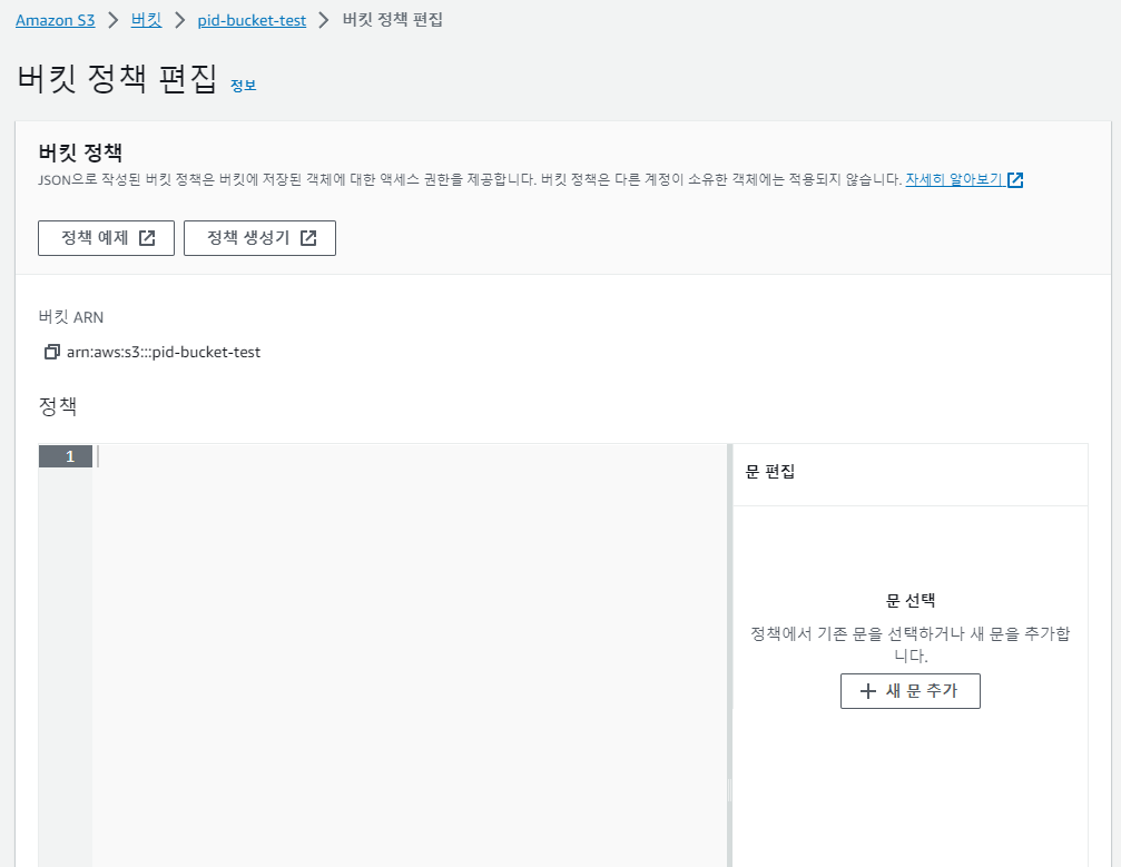 여기서 좀 내려보면 버킷 정책이 보인다.