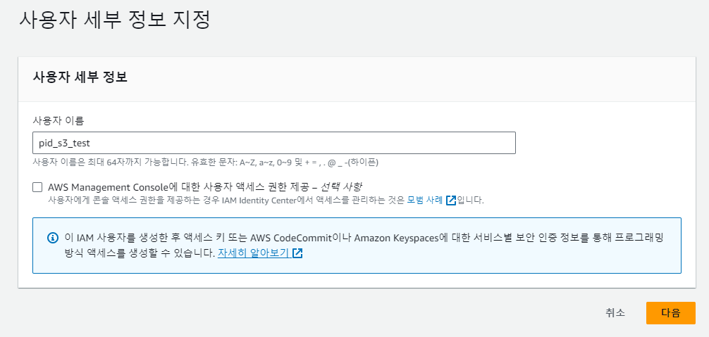 사용자 이름 pid_s3_test 로 해준다.