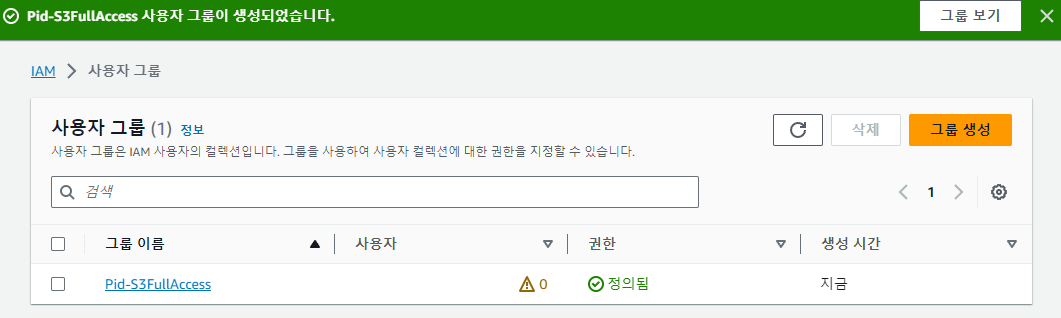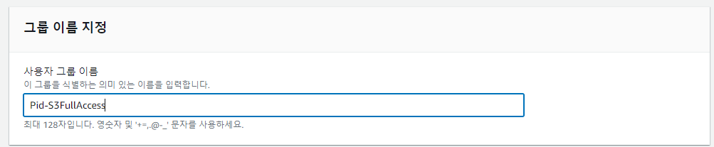 원하는 사용자 그룹 이름으로 정한다 Pid-S3FullAccess 로 하겠다.
