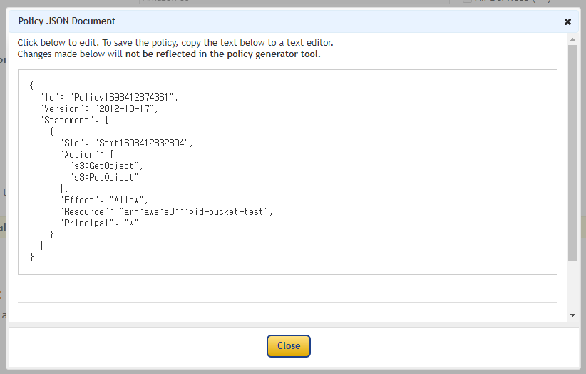 수정 해주고 복사 하고 버킷 페이지로 돌아온다.