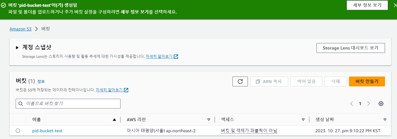 버킷 이름만 pid-bucket-test 로 해서 나머지는 동일하게 생성 했다.