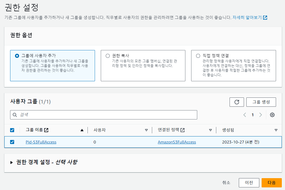 원하는 사용자 그룹 이름으로 정한다 Pid-S3FullAccess 로 하겠다.