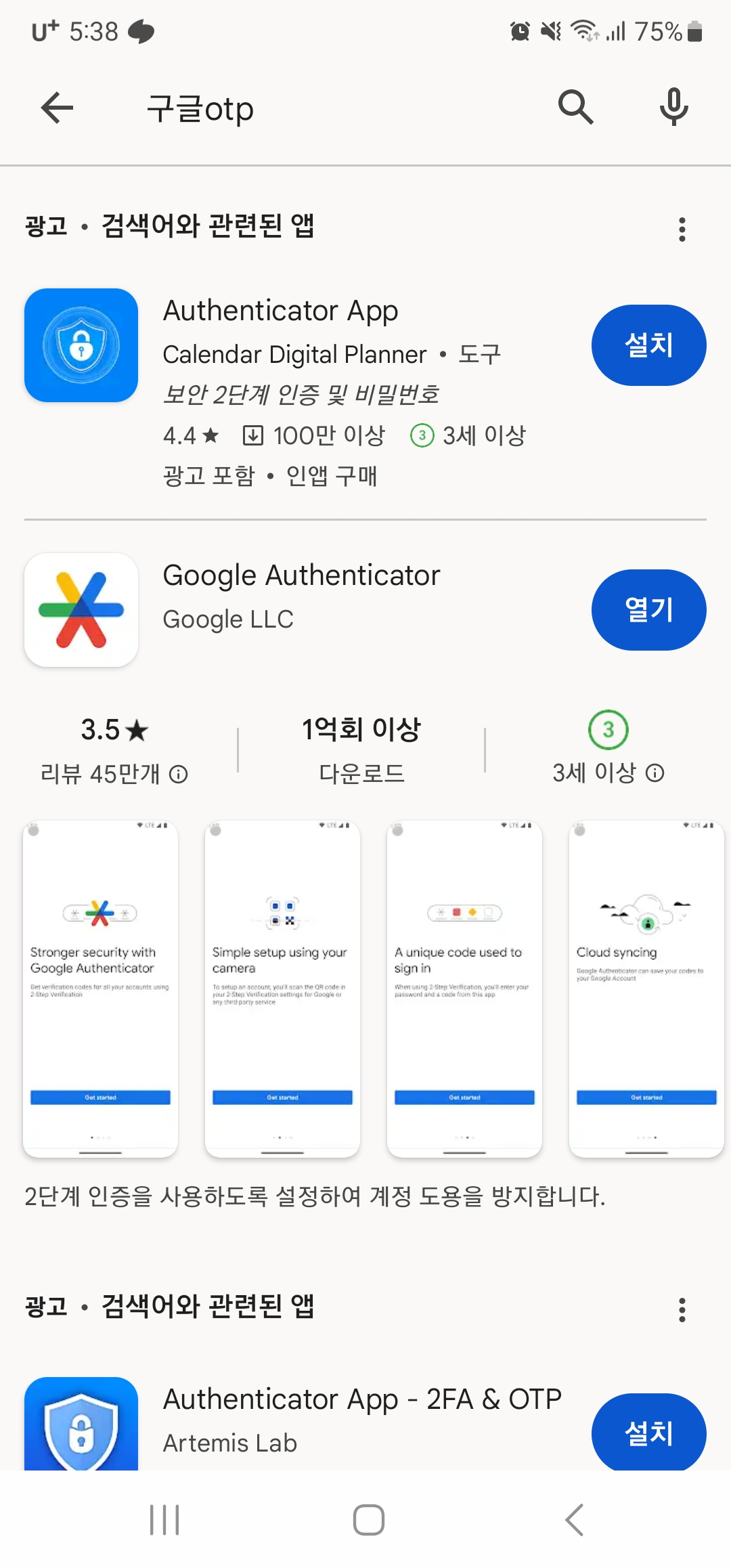 갤럭시 사용시 Play 스토어에서 구글otp 만 검색해도 나온다.