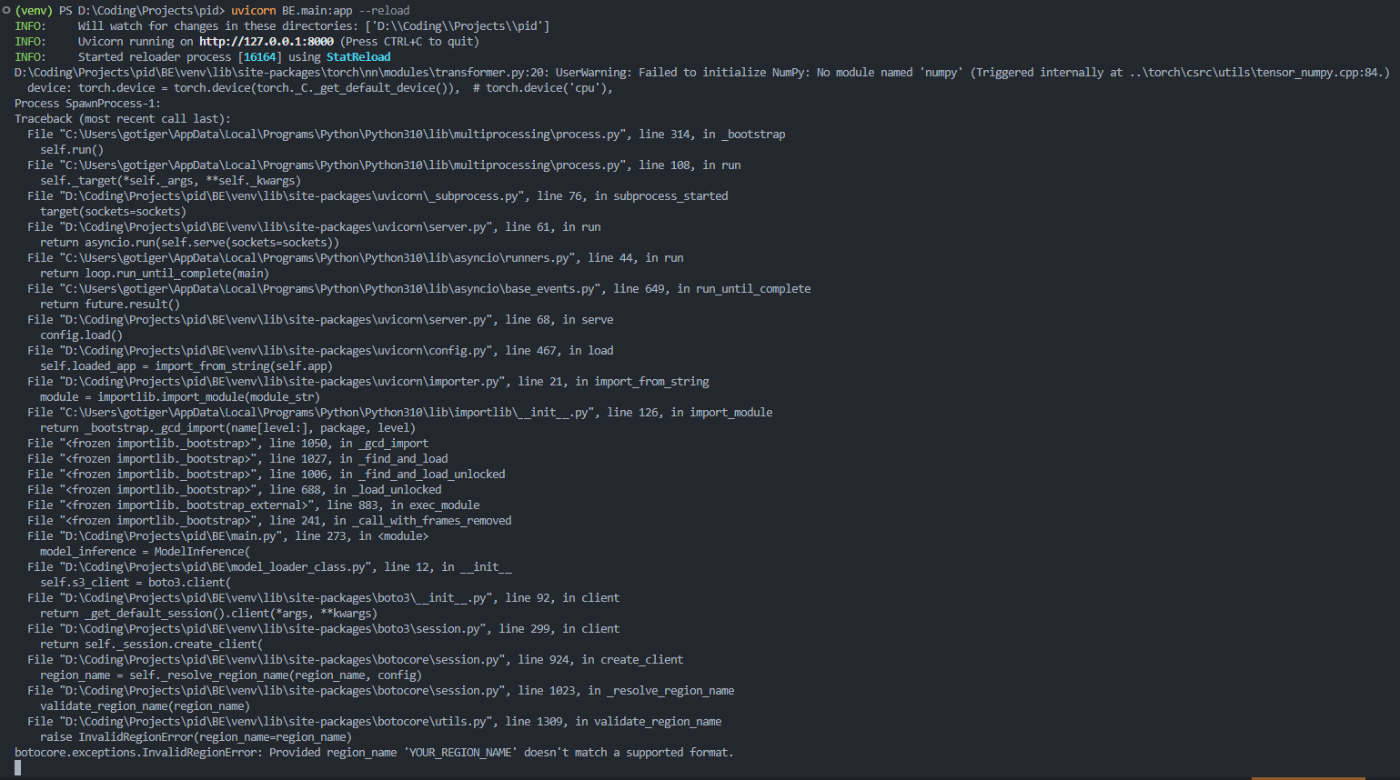 Provided region_name 'YOUR_REGION_NAME' 으로 올바르게 리전을 주지않아서 생기는 문제