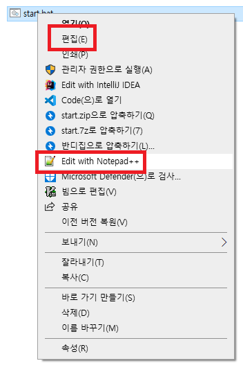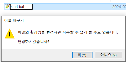 이름을 start.bat이나 (원하는 파일명). bat로 바꿔준다