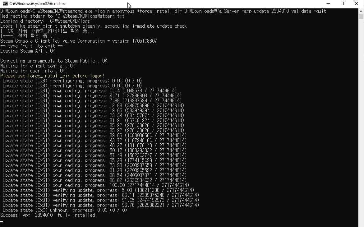 C:\SteamCMD\steamcmd.exe +login anonymous +force_install_dir D:\Downloads\PalServer +app_update 2394010 validate +quit