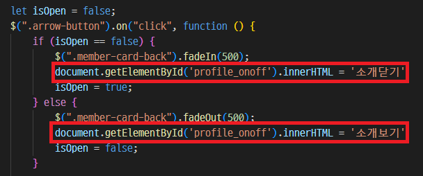 처음에 구글링을 통해 onclick 버튼 클릭시 글자변경 하는방법을 찾아 다른 텍스트와 버튼을 통해 테스트를 하고 바로 적용했다.