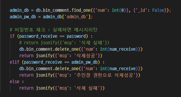 페이지 관리자가 코멘트를 삭제하고 싶을 때, 작성자 코멘트 등록 시 입력하는 비밀번호를 알 수 없어도 미리 db에 등록한 관리자 코드를 통해 해당 단어를 입력 시 코멘트 삭제 가능