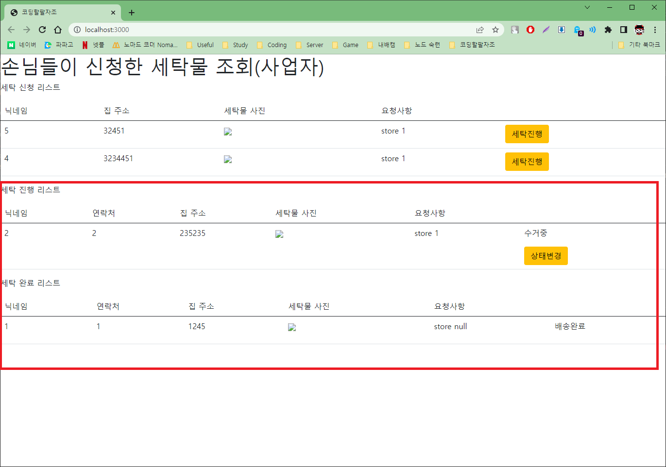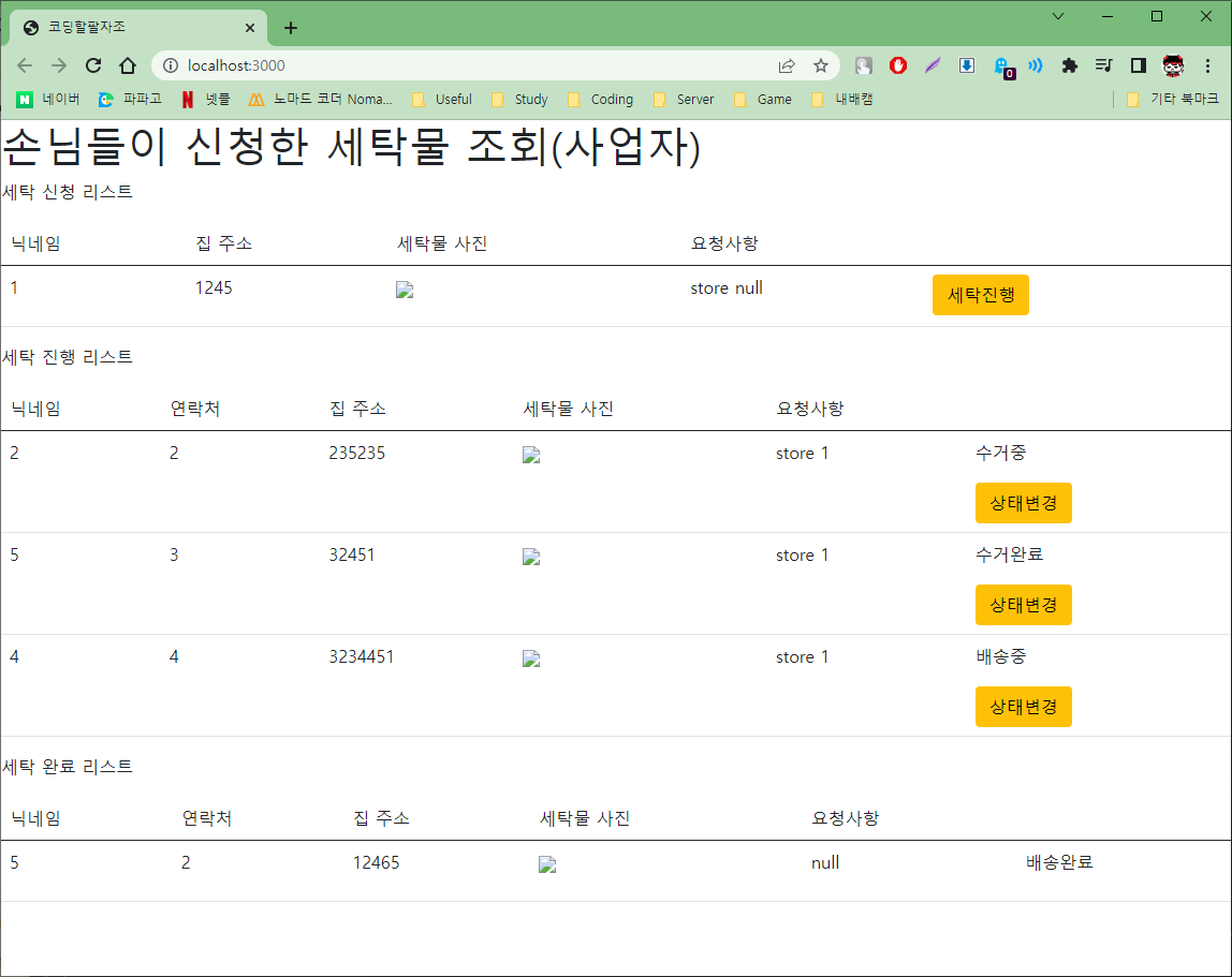 다음처럼 배송물 상태 및 배송완료 되었을때 완료 리스트에 표시되게 구현하였다
