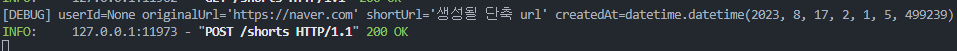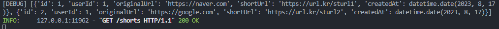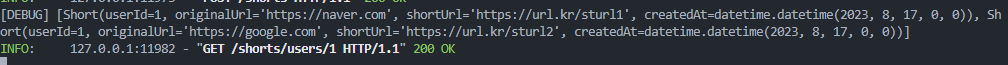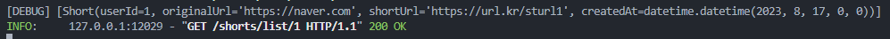 {"id": 1, "userId": 1, "originalUrl": "https://naver.com", "shortUrl": "https://url.kr/sturl1", "createdAt": date.today()},
