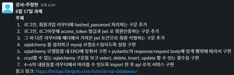 - sqlalchemy 모델들을 내 ERD에 맞춰서 구현 + pydantic의 response/request body에 맞게 행위에 따라서 구현