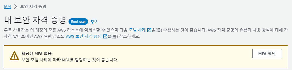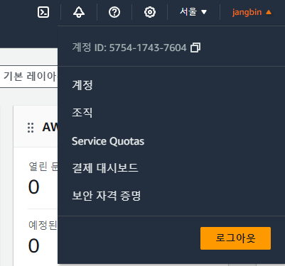 AWS 로그인 후 우측 이름을 클릭 > 보안 자격 증명