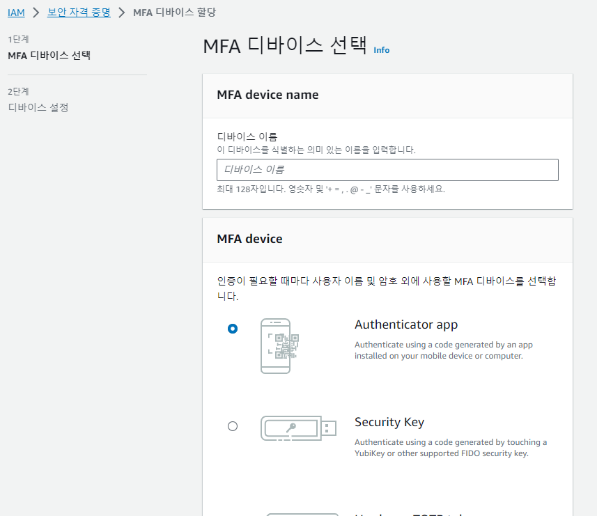 디바이스 이름을 적당히 쓰고 Authenticator app을 선택해주고 다음으로 넘어간다.