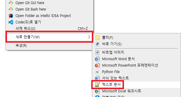 적당한 위치에 새로 만들기 > 텍스트 문서로 새 파일을 만들어준다.