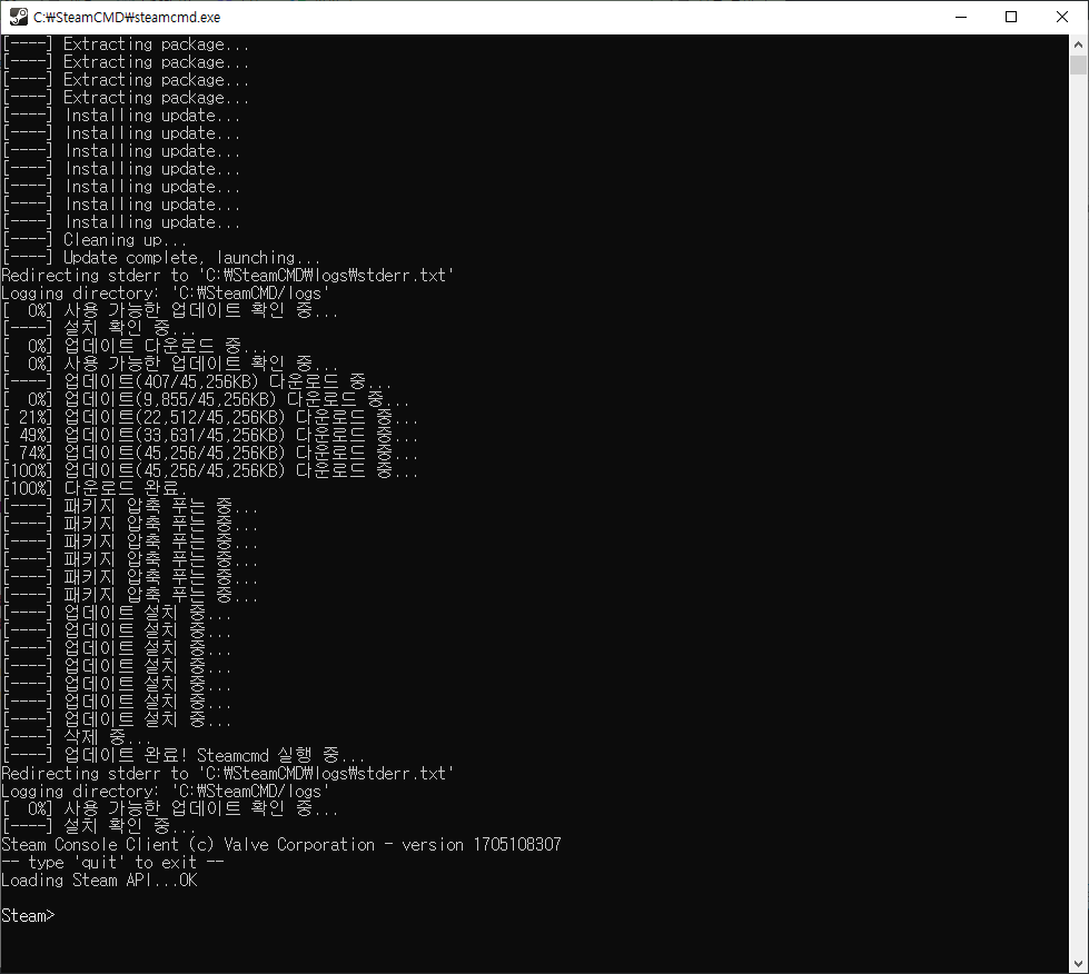 steamcmd.exe를 실행하면 필요한 파일을 다운로드하고 아래와 같이 뜨면 꺼준다.