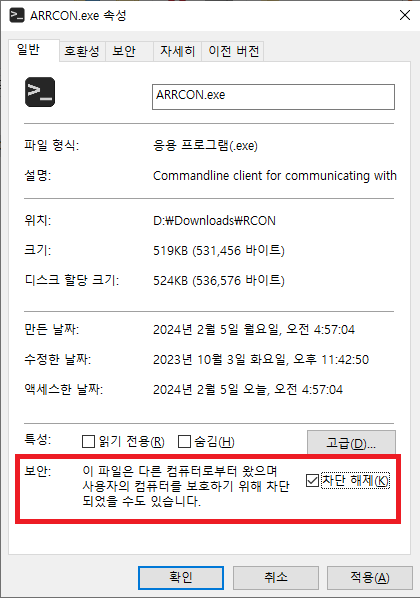 실행 전 윈도우는 속성에 들어가 차단해제를 체크 한다.