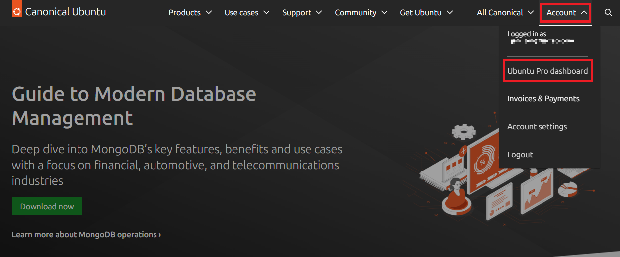 우측상단에 Account > Ubuntu Pro dashboard 를 눌러줍니다.