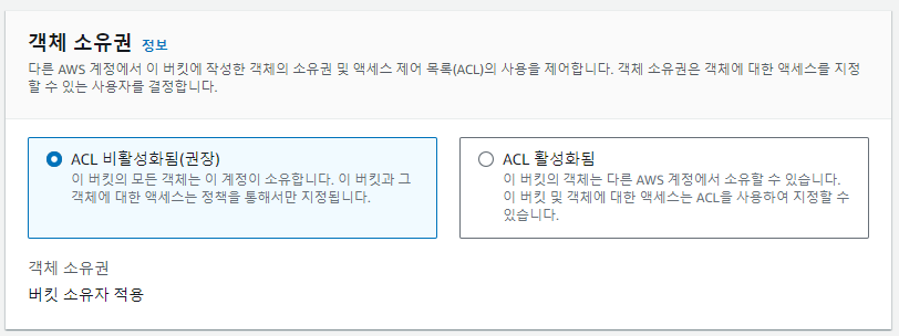 버킷에 업로드된 객체의 소유권을 제어하는 부분입니다.