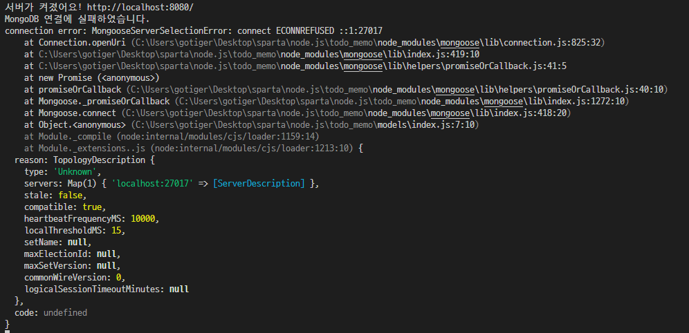 추가 후 node app.js 실행 하고 좀 기다리면 MongoDB 연결에 실패하였습니다. 문구가 뜬다